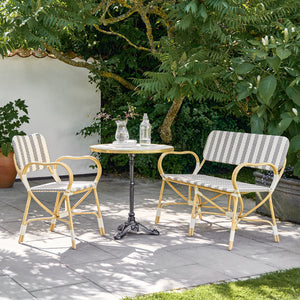 La silla Bistro está diseñada con hermosos apoyabrazos curvados que brindan una buena comodidad y un soporte adicional. La silla es una silla de comedor refinada que está diseñada para brasseries, cafés y restaurantes, pero también es adecuada para el hogar común. La silla Bistro Exterior está hecha a mano en aluminio y ArtFibre, lo que la hace resistente a todo tipo de clima.