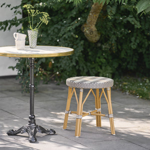 El taburete exterior Simone está tejido a mano con ArtFibre, que es un material extremadamente duradero y resistente a la intemperie hecho de polietileno. Por lo tanto, el taburete puede soportar fuertes lluvias, clima helado y la radiación UV del sol, y puede dejarse al aire libre durante todo el año sin comprometer el diseño o la calidad.