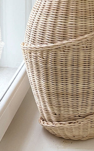 Este artículo está hecho a mano en ratán, que es una planta trepadora que crece como lianas en los árboles de la selva tropical de Indonesia. A menudo se confunde el ratán con el bambú, pero a diferencia del bambú hueco, el ratán es un material sólido. Esto hace que los productos de ratán sean muy duraderos y casi imposibles de desgastar.