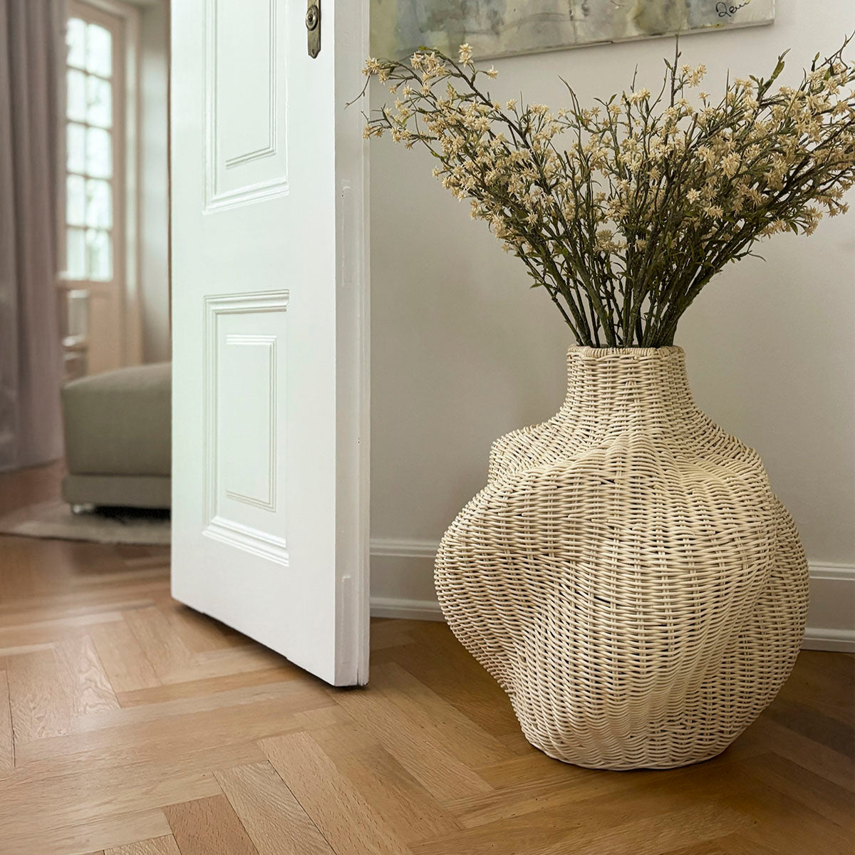 Solaris es una cesta decorativa con formas suaves y orgánicas, ideal para flores secas o artificiales. La cesta está tejida a mano en ratán natural, por lo que pueden existir pequeñas variaciones en color y forma.
