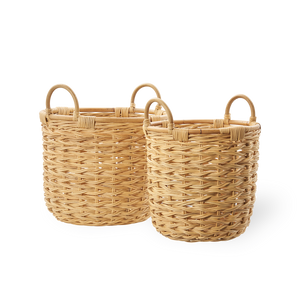 Las cestas vienen en par.El tamaño más pequeño tiene un diámetro de 38 cm y mide 47 cm de alto.El tamaño más grande tiene un diámetro de 48 cm y mide 50 cm de alto.