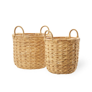 Las cestas vienen en par.El tamaño más pequeño tiene un diámetro de 38 cm y mide 47 cm de alto.El tamaño más grande tiene un diámetro de 48 cm y mide 50 cm de alto.