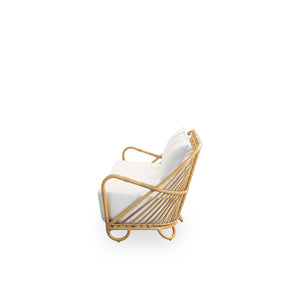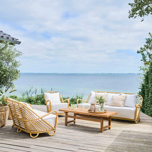 El Sofá Exterior Charlottenborg está diseñado por Arne Jacobsen y está hecho de materiales Alu-Rattan y ArtFibre.