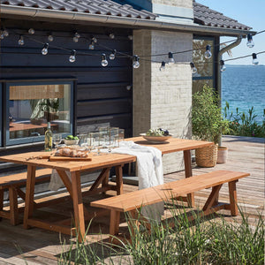 Nuestros muebles de teca para exteriores resisten a todo tipo de clima y pueden permanecer al aire libre durante todo el año. En nuestras mesas de exterior, las tablas de madera se colocan con un pequeño espacio entre ellas para que la madera se expanda y contraiga según el clima.
