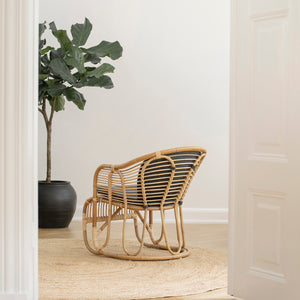 La silla de salón Swing fue diseñada por Tove Kindt-Larsen en 1937. Ese mismo año, el Gremio de Cañas Danés organizó un concurso de muebles de mimbre, donde Tove Kindt-Larsen ganó el tercer premio por la silla "Swing". El elegante sillón está hecho a mano en ratán indonesio, y en la misma serie encontrarás el Sofá Swing.