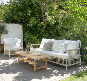 Caroline Exterior está hecha a mano en Alu-Rattan y ArtFibre, lo que le otorga una resistencia y durabilidad únicas. Alu-Rattan es aluminio con recubrimiento en polvo resistente a la intemperie y ArtFibre son fibras artificiales hechas de polietileno. Gracias a estos materiales resistentes al clima, el sillón puede permanecer al aire libre todo el año sin comprometer el diseño ni la calidad.