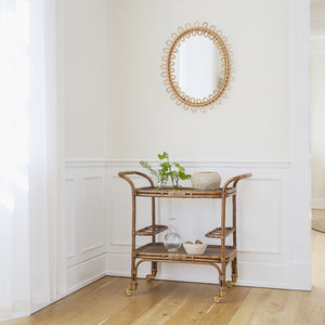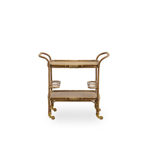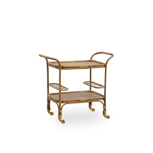 El carrito Carlo está hecho de ratán sostenible de Indonesia. Nuestro carrito de bar está fabricado en color antiguo, que es acogedor y adecuado para cualquier ocasión. La mesa de bar de ratán consta de uniones hechas a mano sobre una estructura tejida por hábiles artesanos del mimbre. El carrito se puede usar en la sala de estar o en la cocina como mesa auxiliar o para servir elegantes bebidas directamente desde la mesa. La mesa tiene cuatro ruedas, por lo que puedes mover el carrito fácilmente en ocasiones especiales. El carrito Carlo ha sido diseñado por Sika Design, ubicada en Fyn cerca de Rynkeby.