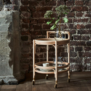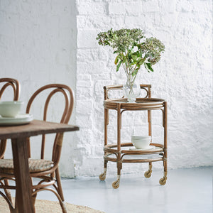 El carrito Romeo 4025A está hecho de ratán sostenible de Indonesia. Nuestro carrito viene en color antique, que es acogedor y combina con todo tipo de madera. La mesa consta de envolturas hechas a mano sobre una estructura de ratán elaborada por hábiles cesteros. Nuestro carrito Romeo puede suministrarse con una fina tapa redonda de vidrio. El Romeo puede usarse como un carro bar, pero también es muy útil como soporte para plantas, mesa auxiliar en la cocina e incluso puede servir como una encantadora mesita de noche. El carrito Romeo ha sido diseñado por Sika-Design, cuya sede se encuentra en Fionia cerca de Rynkeby.