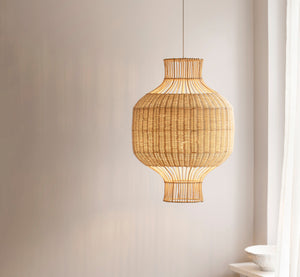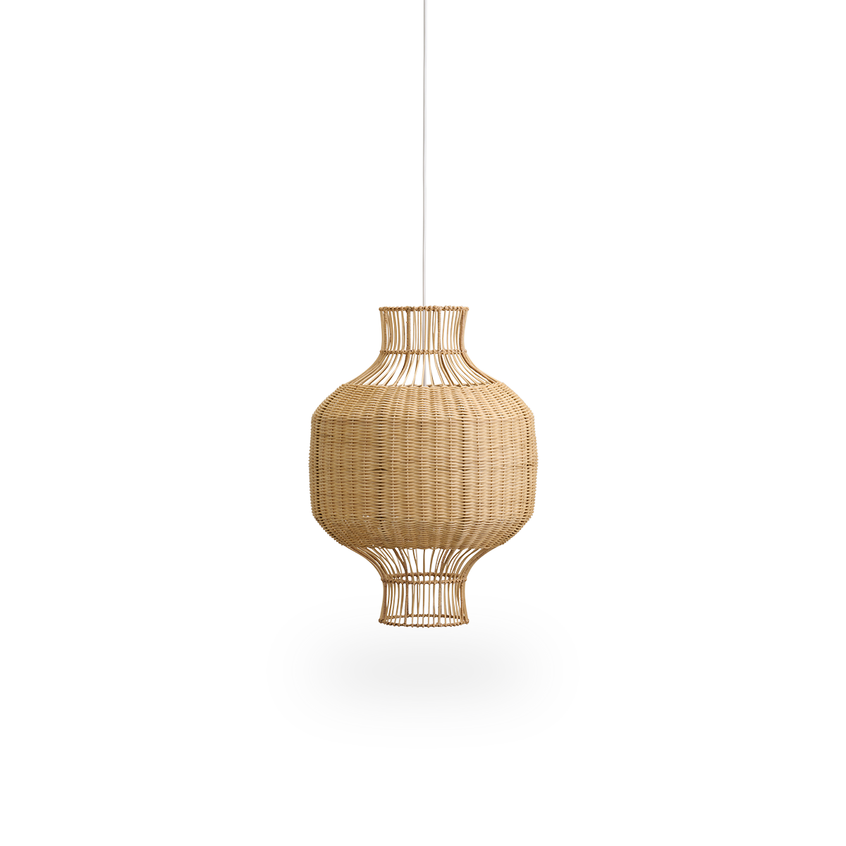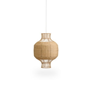 Nuestra pantalla de lámpara Hikari está diseñada por Jin Kuramoto. La pantalla de la lámpara está hecha a mano en ratán indonesio y tiene un marco interior de hierro que le da un buen peso, asegurando que cuelgue de manera agradable y estable.
