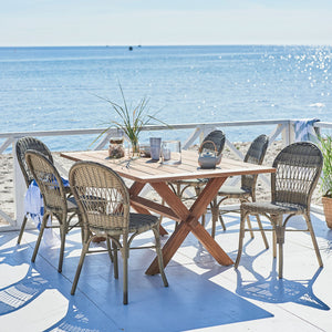 Nuestra mesa de comedor Colonial está hecha de madera de teca para exteriores. Gracias a su contenido de aceite natural, la madera es muy duradera, resistente al viento y a la intemperie, y no se ve afectada por insectos ni pudrición. Con el tiempo, los muebles de teca expuestos al sol y la lluvia adquieren un hermoso color gris plateado.