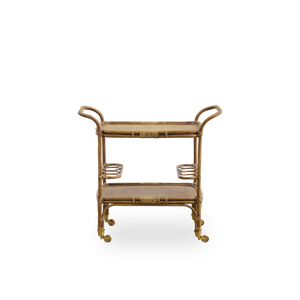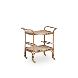 El carrito Carlo está hecho de ratán sostenible de Indonesia. Nuestro carrito de bar está fabricado en color antiguo, que es acogedor y adecuado para cualquier ocasión. La mesa de bar de ratán consta de uniones hechas a mano sobre una estructura tejida por hábiles artesanos del mimbre. El carrito se puede usar en la sala de estar o en la cocina como mesa auxiliar o para servir elegantes bebidas directamente desde la mesa. La mesa tiene cuatro ruedas, por lo que puedes mover el carrito fácilmente en ocasiones especiales. El carrito Carlo ha sido diseñado por Sika Design, ubicada en Fyn cerca de Rynkeby.
