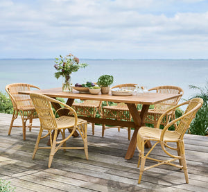 Nuestra mesa de comedor Colonial está hecha de madera de teca para exteriores. Gracias a su contenido de aceite natural, la madera es muy duradera, resistente al viento y a la intemperie, y no se ve afectada por insectos ni pudrición. Con el tiempo, los muebles de teca expuestos al sol y la lluvia adquieren un hermoso color gris plateado.