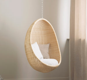 Hanging Egg es especialmente adecuada para habitaciones con techos altos, donde hay aire y espacio suficiente para que la elegante silla hamaca luzca todo su esplendor. La silla puede colgarse de dos maneras: ya sea con una cadena directamente al techo o mediante un soporte independiente. Ambos se adquieren como complementos adicionales. La cadena para el techo mide 150 cm y puede acortarse según sea necesario. No se incluye gancho para el techo, ya que depende del tipo de techo.